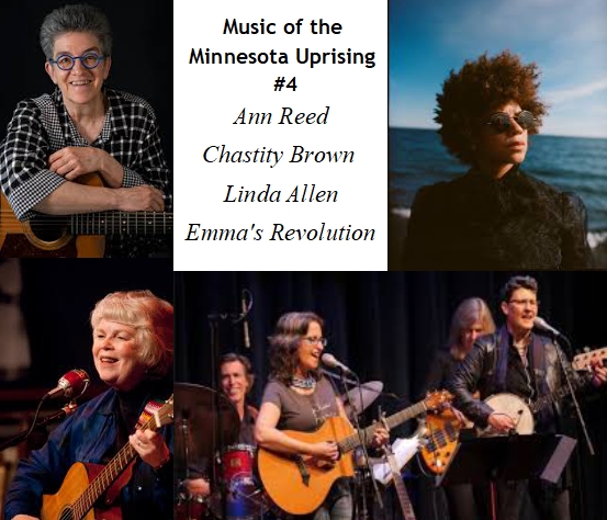 The 4th installment of songs inspired by the Minnesota Uprising, today's songs are harvested from Minnesota, Washington State, the Bay Area of California, and, again, Minnesota, so these songs will be witnessed and sung from both the inside and outside. You'll hear heartbreak & admiration, determination & inspiration, and love & power. Ann Reed and Chastity Brown both share songs related to what they experienced on the ground in the Twin Cities, while Emma's Revolution and Linda Allen see the beauty and power from a distance and are channeling it for work across the country. We'll likely have a 5th episode soon - it just doesn't stop!